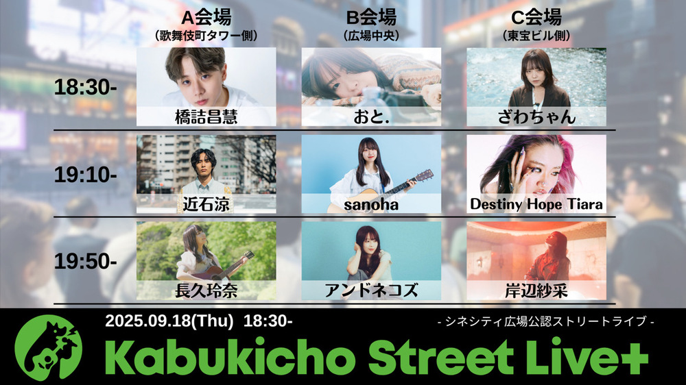 Kabukicho Street Live+ SCHEDULE 2025/09/18(木) 18:30 - 19:00 シネシティ広場 東宝ビル前 ストリートライブ 【LIVE告知】 9月18日(木)18:30〜 「Kabukicho Street Live+」inシネシティ広場 に出演させていただきます〜! 久々の公認ストリートライブ 大型ビジョンへの投影もあるそうです〜! 帰ってこられて嬉しい🥹 新曲も持っていくよ〜!ぜひお越しください! URLをコピーする 報告する